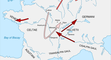 (February 3, 2026) The Gallic Wars were waged between 58 and 50 BC by the Roman general Julius Caesar against the peoples of Gaul. The Wars culminated in the decisive Battle of Alesia in 52 BC, in which resulted in a complete Roman victory and the expansion of the Roman Republic over the whole of Gaul. Caesar's Roman legion movements are shown by the dark red arrows in the above map.