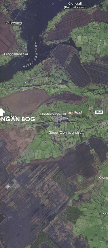 (April 1, 2026) Clonmacnois is located to the left of the Mongan bog in this arial view. Clonmacnois used to be surrounded by bogs, most of which today have been mined for peat. This leads to the ironic consequence that the few remaining natural Irish bogs have a higher elevation then the drained mined bogs.
