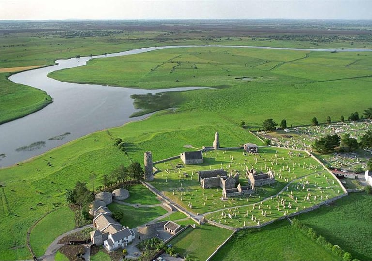 (April 1, 2026) Arial view of the center of Clonmacnois. Christian records indicate this monestary was founded around 550 CE by St Ciarán. Ciarán was the son of a craftsman. After completing his education, Ciarán became the founder of a small monastery on Hare Island in Lough Ree, before choosing the site of Clonmacnoise to establish another monastery.