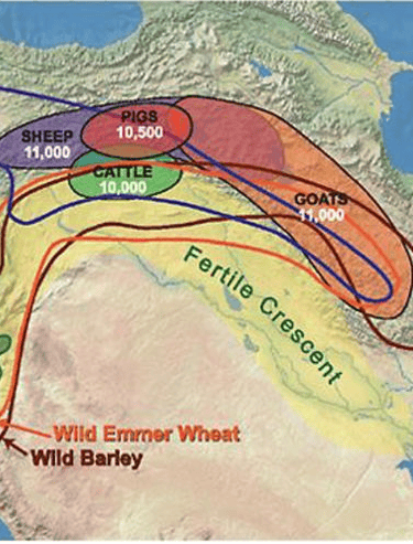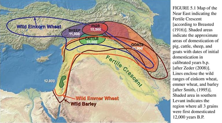 This map shows the location of the earliest agricultural domestications known to archaeology which were apparently done simultaneously by Akkadian speakers living in the northern fertile crescent and Sumerian speakers living in the southern part along the Tigris and Euphrates rivers. The Akkadians included animal husbandry along with crop harvesting. The Sumerians invented the first writing to keep track of their harvests and they wrote in a pictographic form of cuneiform. The Akkadians later adopted that style of writing to their own language as they settled down.