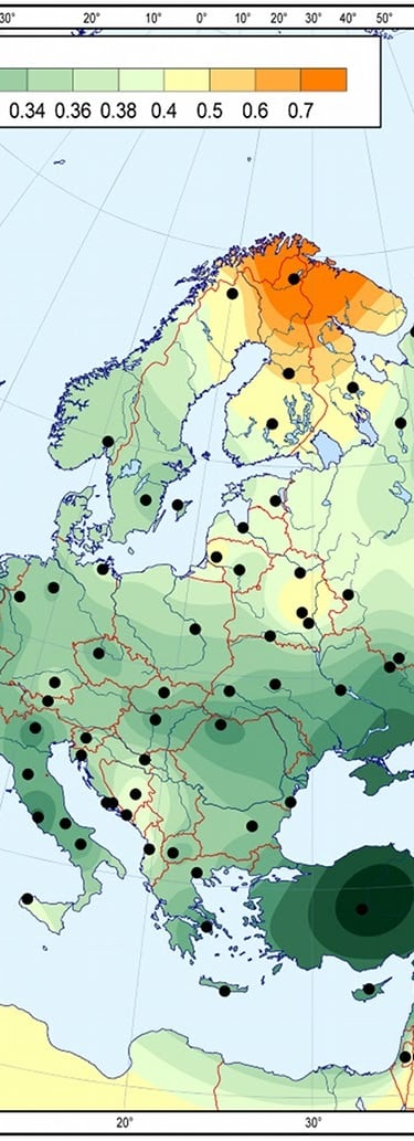 This map shows the spread of farming from the Akkadian fertile crescent as determined by archaeology. These farmers started migrating as the ice started melting from the Ice Age around 9600 BCE. They reached Britain by 4100 BCE. Akkadian is the native language of fertile crescent as revealed by ancient local cuneiform texts. The 2 branches of migration (north and south) through Europe is often reflected in the differing etymologies of the same word (example "cinder").